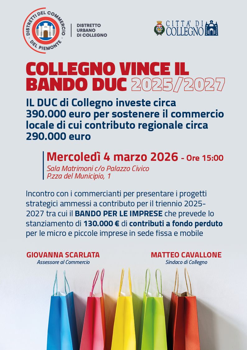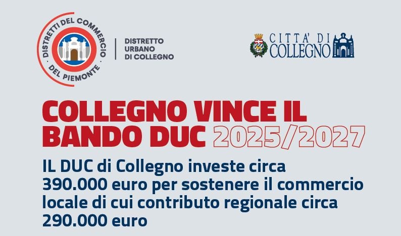 Come già annunciato, il DUC di Collegno è risultato nuovamente vincitore del Bando al sostegno di progetti strategici dei Distretti del Commercio anni 2025 - 2027 della Regione Piemonte.