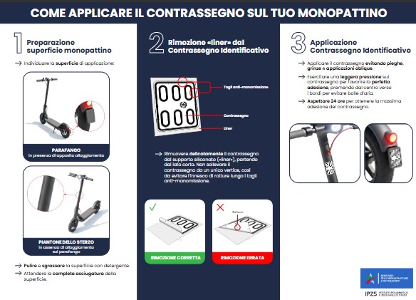 - il proprietario del monopattino deve effettuare la richiesta accedendo direttamente alla piattaforma telematica e può richiedere il ritiro del contrassegno identificativo presso gli Uffici della Motorizzazione Civile o presso gli studi di consulenza automobilistica (in tal caso corrispondendo, altresì, la somma determinata da questi nel rispetto della normativa di riferimento vigente).