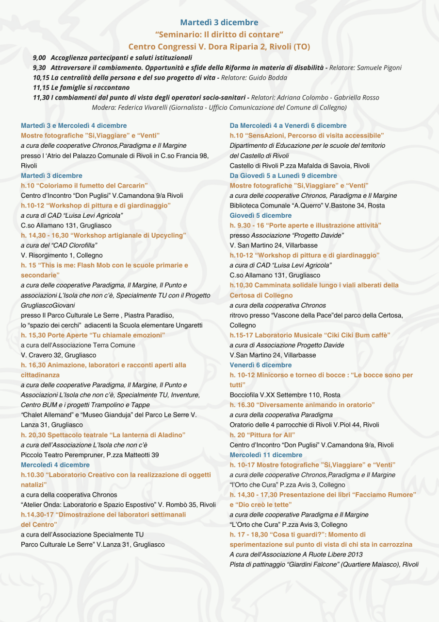 L’apertura ufficiale della rassegna è prevista il 3 dicembre con il seminario “Il diritto di contare”, ospitato presso il Centro Congressi di Rivoli, dedicato alle opportunità e alle sfide introdotte dalla nuova riforma nazionale in materia di disabilità.